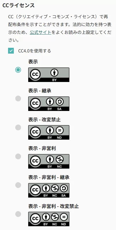 簡単ライセンス: 私的利用での改変、非改変作品の再配布、改変作品の再配布、商用利用をラジオボタンで簡単にライセンスを設定できるタイプです。(選択するだけなのでおすすめ)