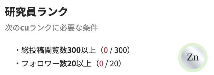 研究員ランクは5種類あり、閲覧数およびフォロワー数に応じて上がっていきます。
