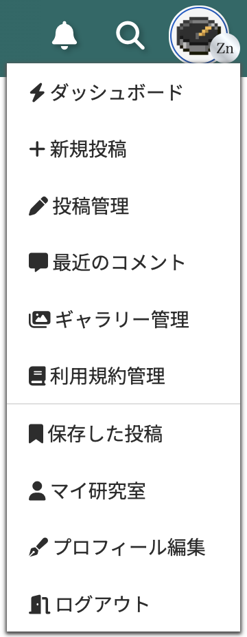 研究員登録すると、右上のアイコンから研究員メニューにアクセスできます。